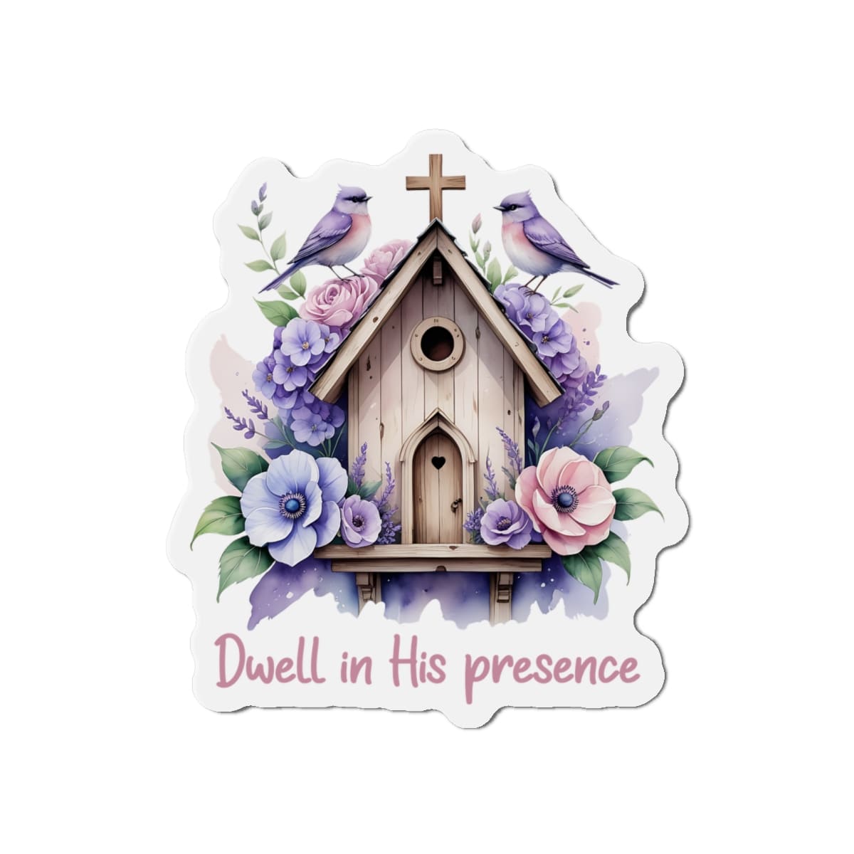 Carry a daily reminder of God’s peace with this beautifully designed Christian sticker. Featuring the uplifting message “Dwell in His Presence”, this sticker combines a delicate birdhouse, floral accents, and a cross — creating a peaceful, faith-filled image to brighten any space.