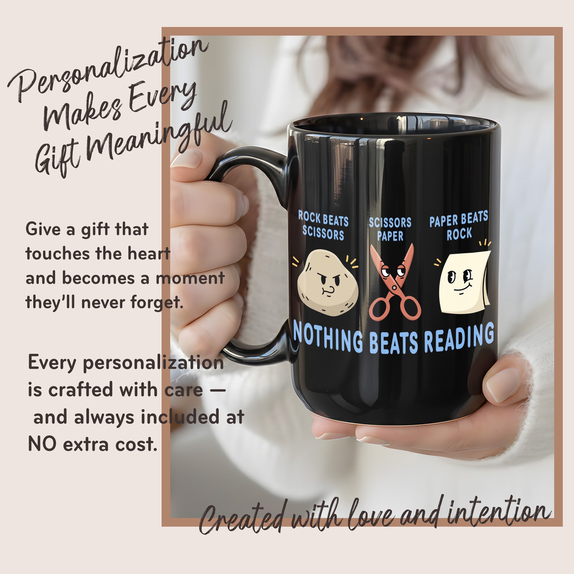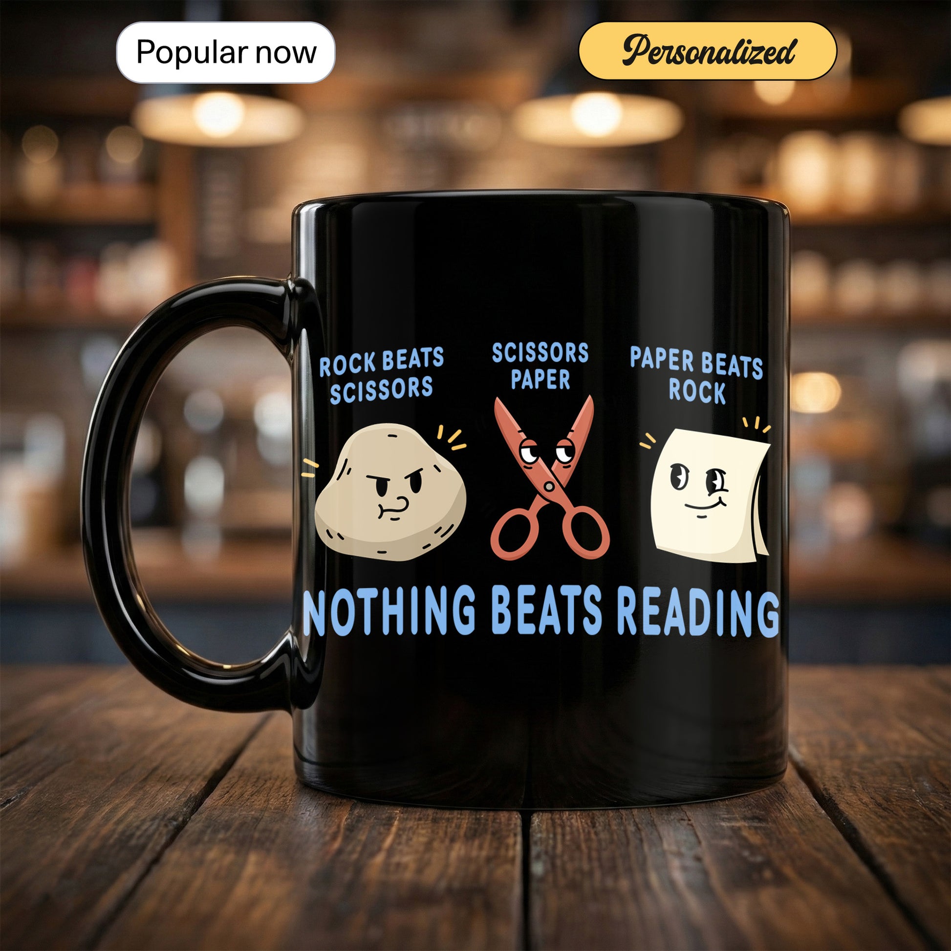 Bring humor and bookish charm to your daily routine with this “Nothing Beats Reading” Funny Book Lover Mug. Inspired by the classic Rock–Paper–Scissors game, this design cleverly flips the rules to celebrate what readers already know — nothing beats a good book.