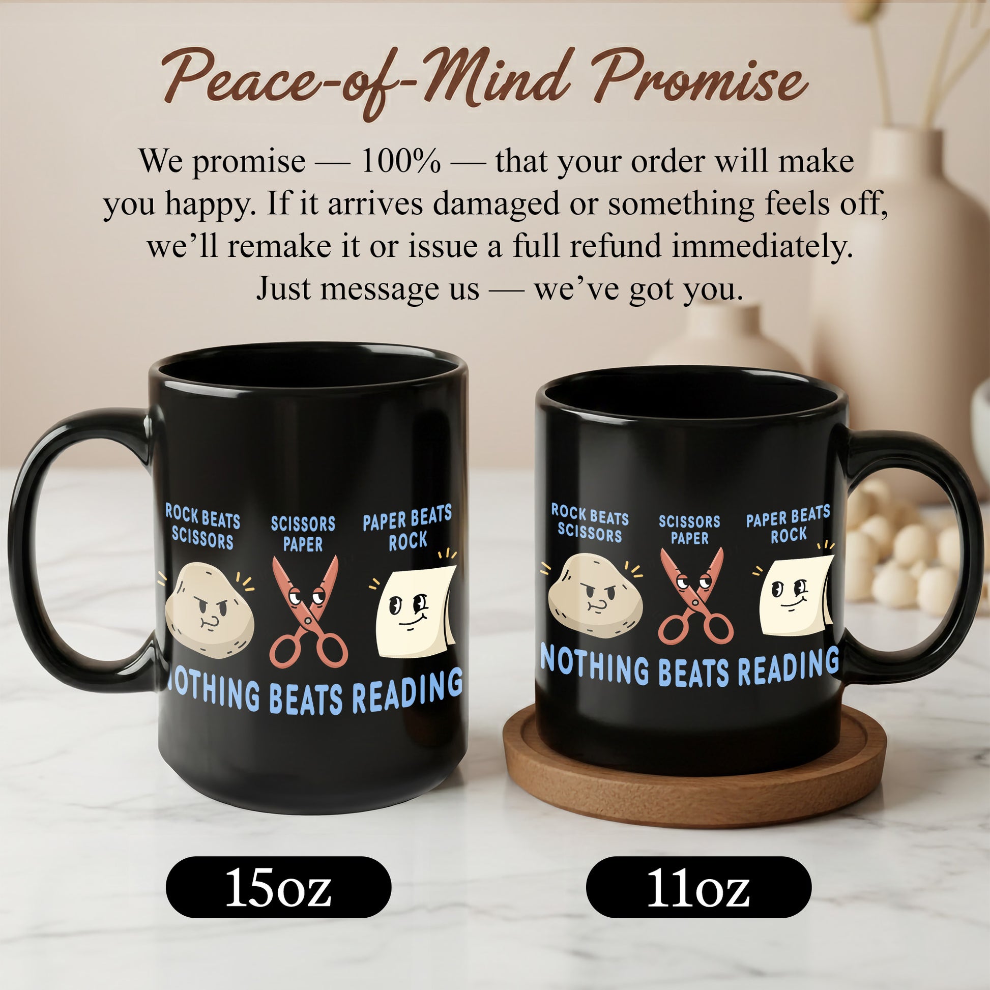 Funny Reading Mug – “Nothing Beats Reading” Rock Paper Scissors Design | Book Lover Coffee Cup for Readers & Bookworms | Mug 5
