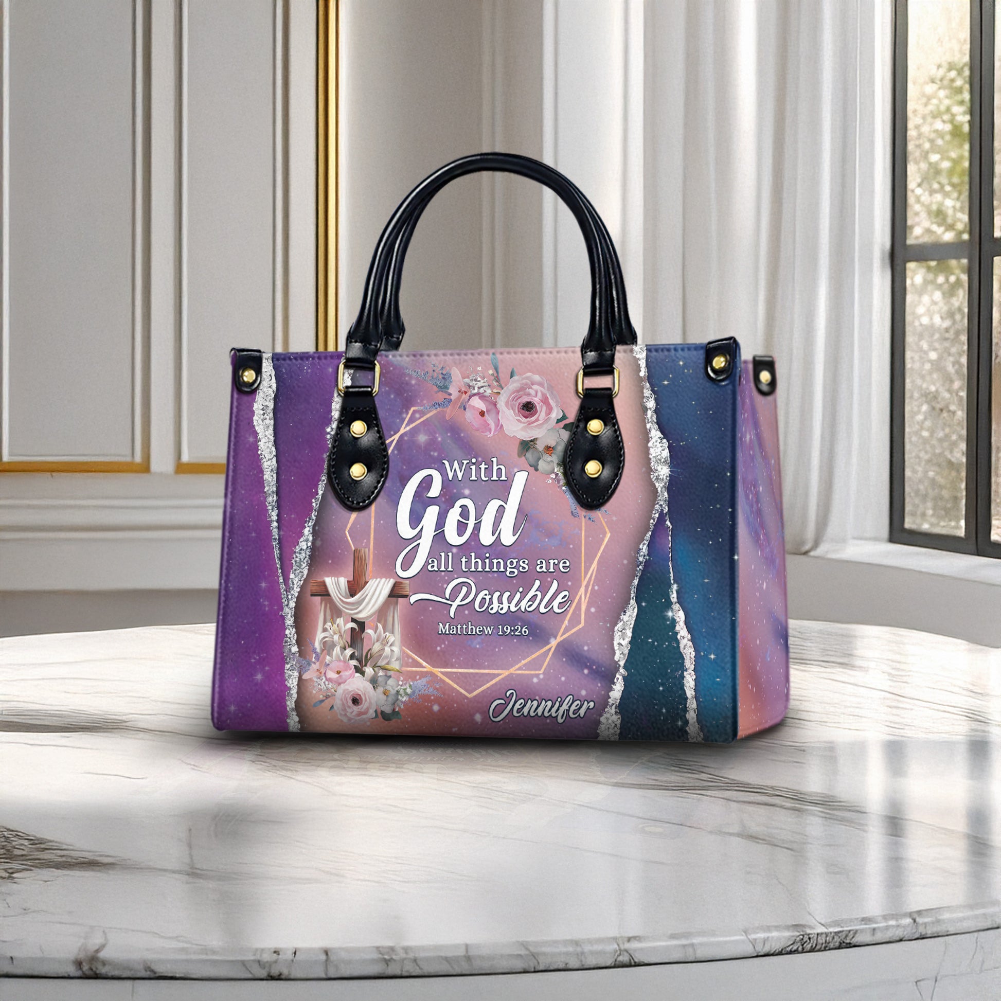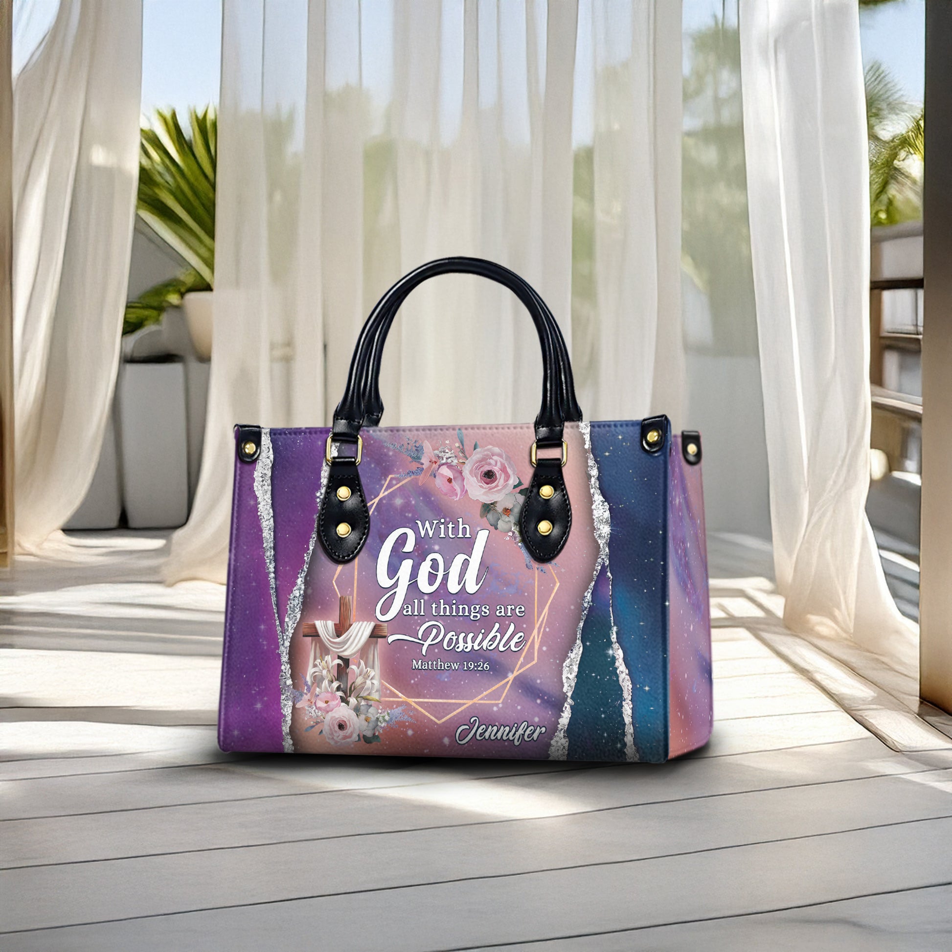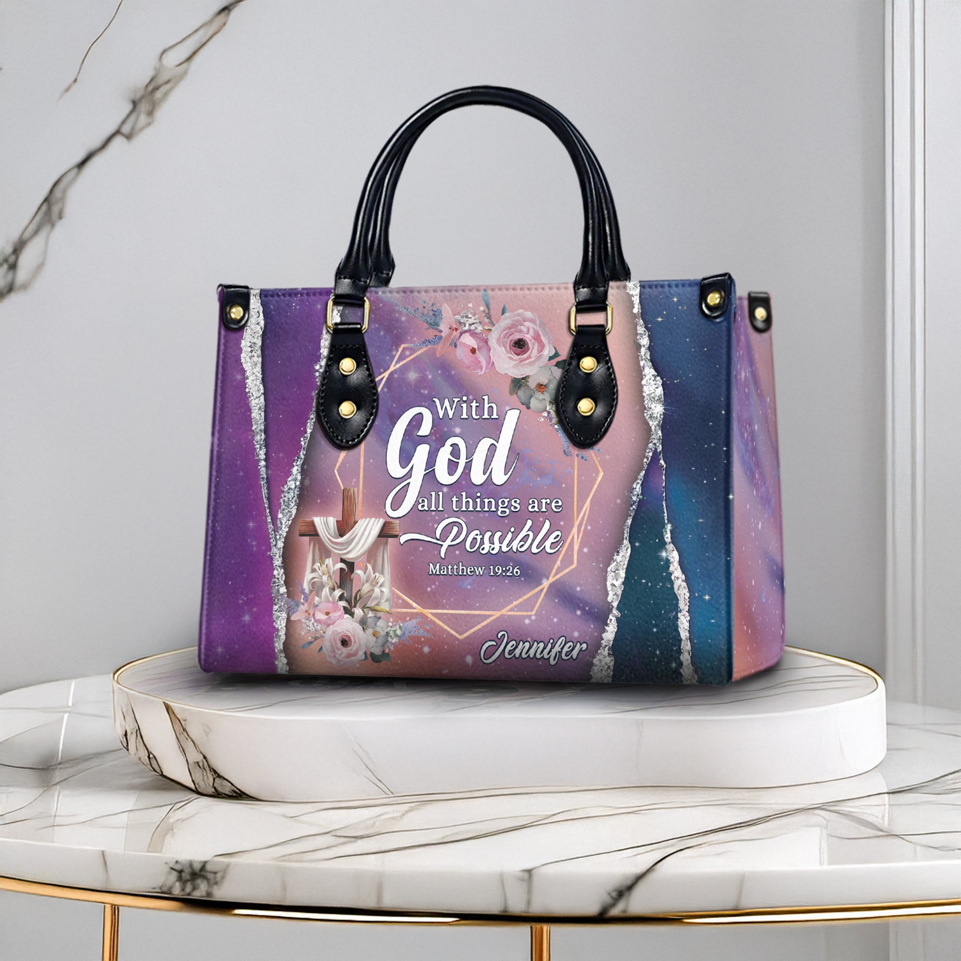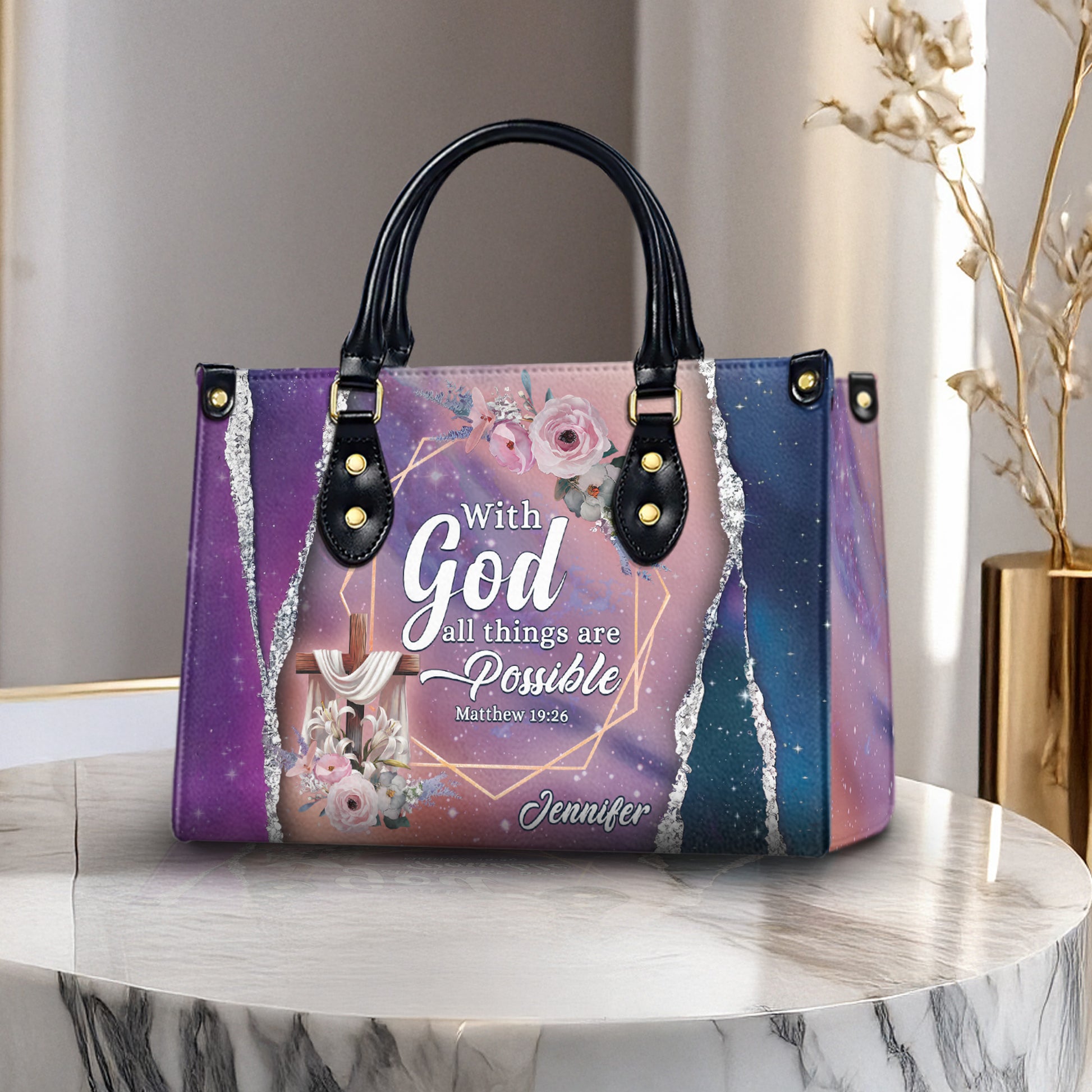 HB39-With God All Things Are Possible Handbag, Personalized Christian Leather Purse for Women, Matthew 19:26 Bible Verse Gift, Faith Tote Bag