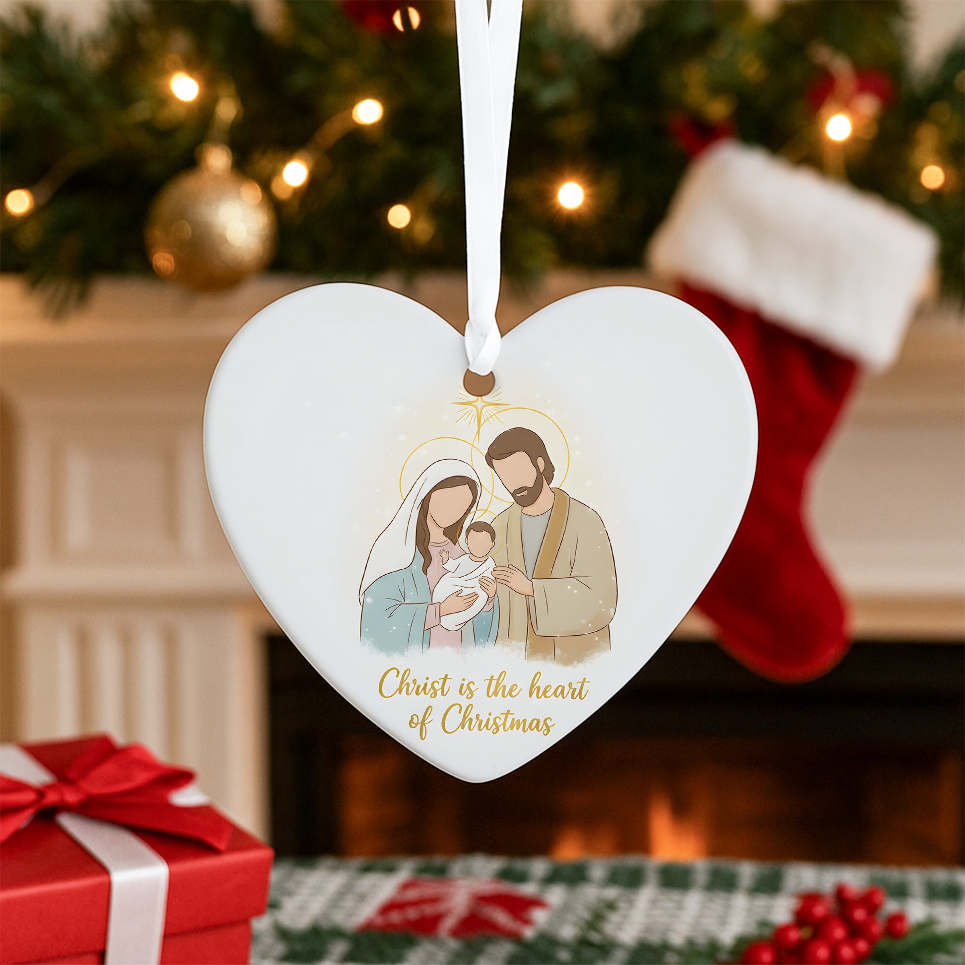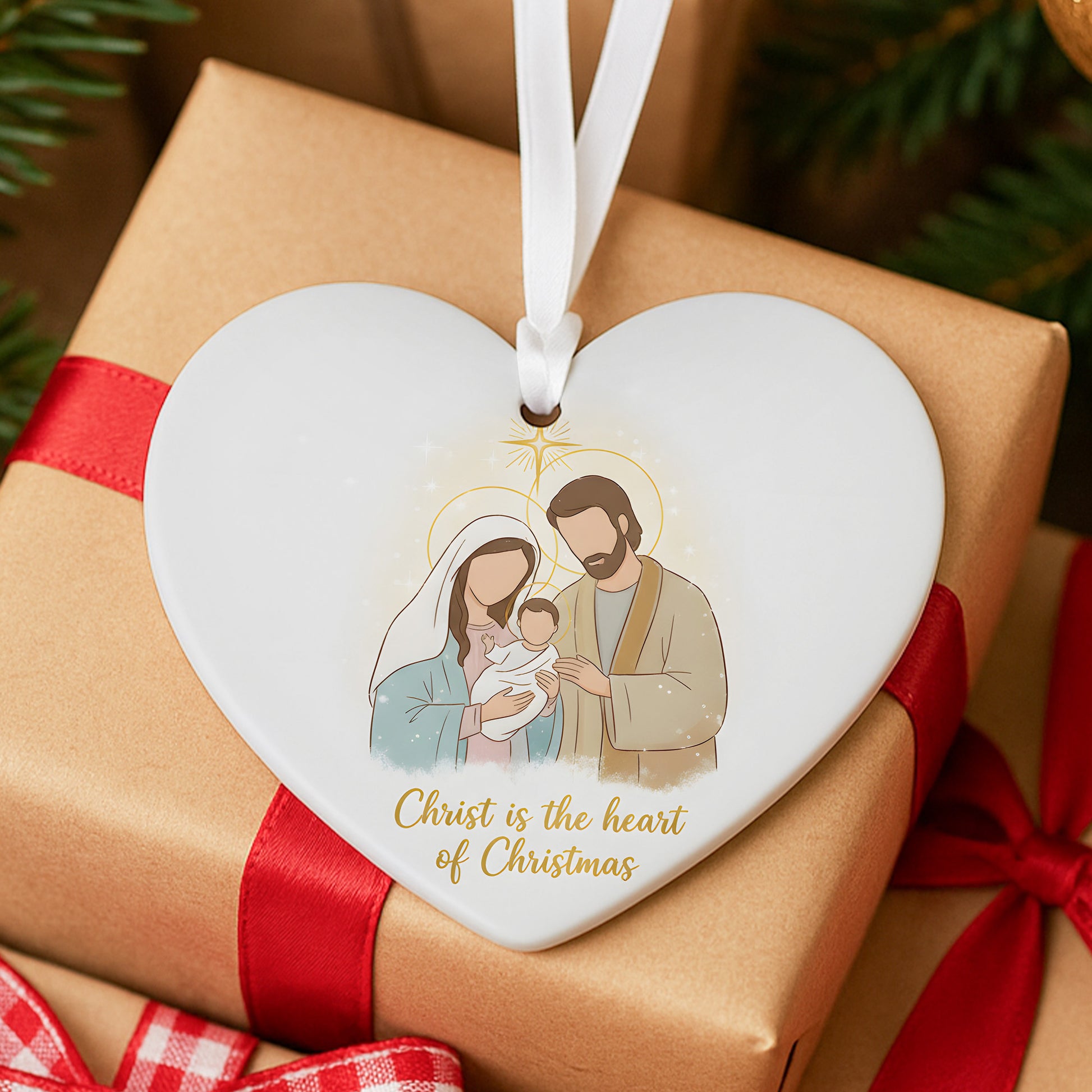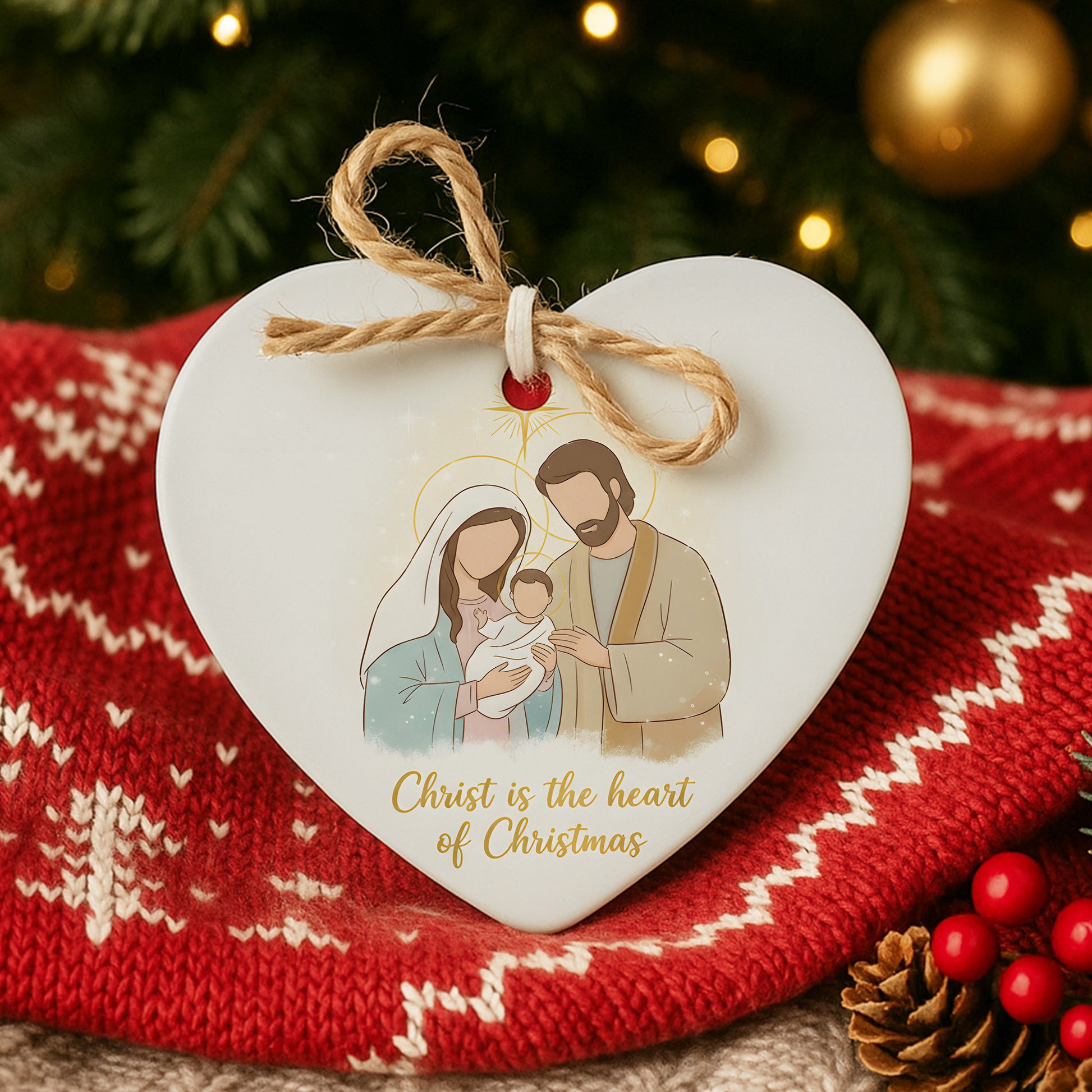 Christ Is the Heart of Christmas Ornament, Holy Family Nativity Heart Ceramic Decor, Christian Christmas Ornament, Religious Gift Idea|ONM10